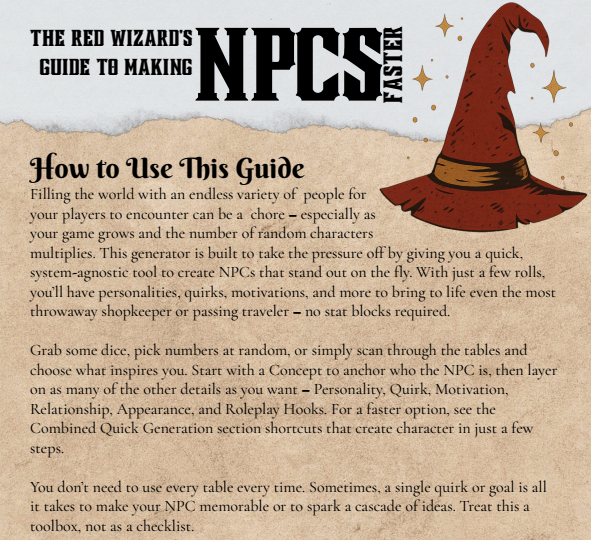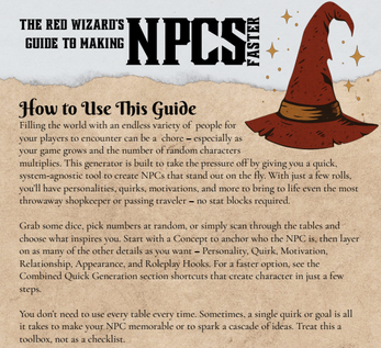 Running a TTRPG is hard enough - creating a never-ending parade of memorable NPCs shouldn’t be. The Red Wizard’s Guide to Quick NPC Generation gives you a fast, system-agnostic way to generate fully fleshed-out characters in minutes.
