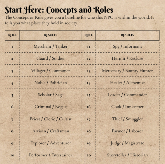 20 options for Concepts, Personality Traits, Quirks, Motivations, Relationships, Appearance, and Roleplay Hooks